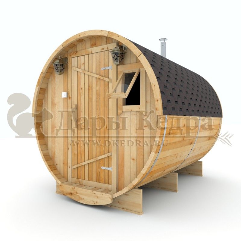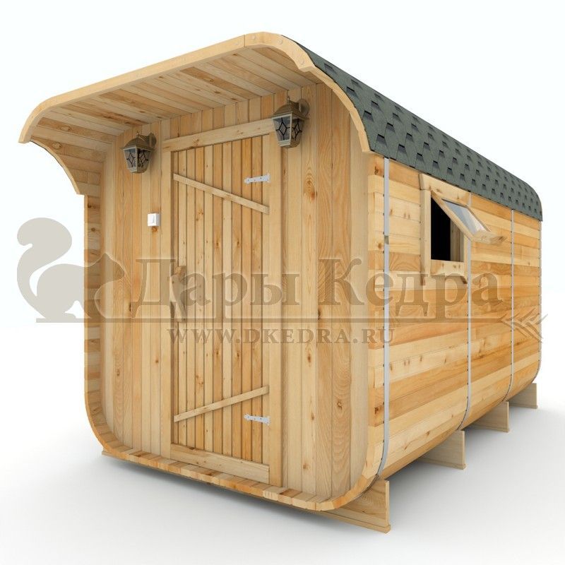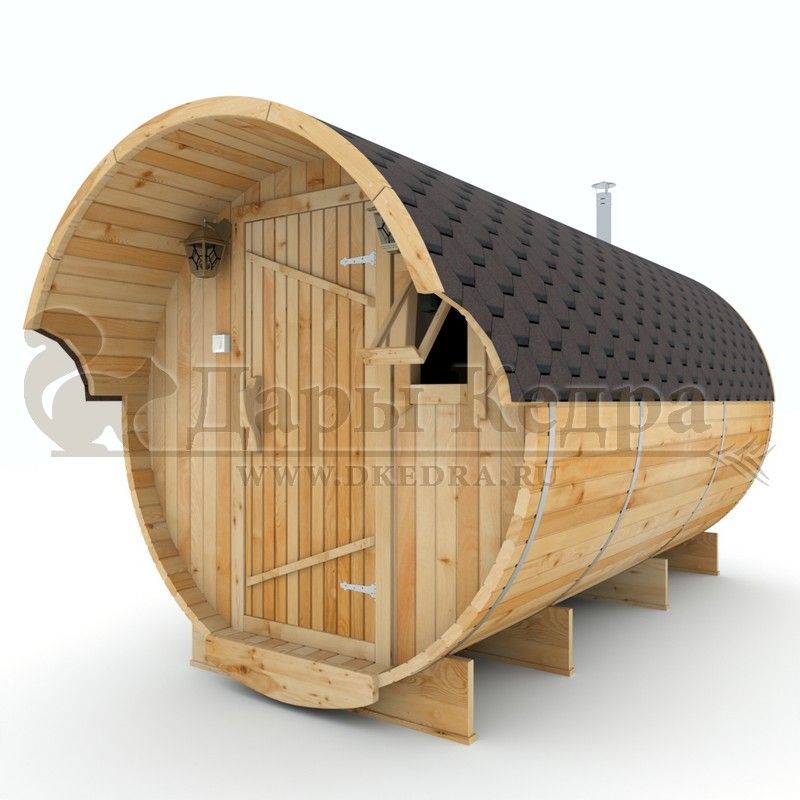 Баня-бочка буханка из кедра с козырьком (все размеры) Баня-буханка более просторная за счет увеличенной высоты потолков и ровного пола. Козырек не только украшает баню, но и защищает оставленную обувь от дождя. Лавочки из кедра находятся по всей длине бани-бочки с обеих сторон. Печь расположена в парилке около дальней стены. Время растопки такой бани не превышает 30 минут. В зависимости от выбранного размера баня-бочка буханка с козырьком имеет следующую комплектацию: Баня-бочка буханка 2,5 метра - парилка; Баня-бочка буханка 3,5 и 4,5 метра - раздевалка, парилка; Баня-бочка буханка 5,5 метров - раздевалка, парилка, моечная. По вашему желанию ее можно укомплектовать печью с внешней загрузкой, благодаря которой весь мусор вовремя топки остается на улице. Баня-бочка буханка не требует полноценный фундамент, поэтому при необходимости ее можно перенести в другое место. Обращаем Ваше внимание, что в стандартную комплектацию бани входят полки открытого типа в парной с обеих сторон. Дополнительно можно заказать полок закрытого типа или лавку! Кедр обладает ароматическими свойствами. Он не деформируется и влагоустойчив, при правильном уходе за деревом на нем не развиваются грибки и плесень.