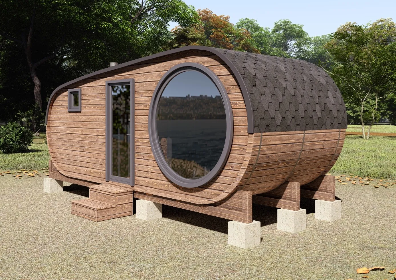 Баня-бочка «Орео» с боковым входом и панорамным окном Стильная и современная баня-бочка с боковым входом может быть выполнена длиною от 4 метров, что-бы было два отделения (парилка и комната отдыха). Полок может быть, как с двух сторон, так и угловой, в стандарте одноуровневый. Печь в данной модели расположена сбоку с топкой наружу, либо внутрь парилки. Печь можно укомплектовать баком для воды, а саму баню сделать длиною до 6 метров, комфортно разместив в ней дополнительно помывочную. В эту модель включено два закаленных стеклопакета: круглое и полукруг, которые мы можем разместить на ваше усмотрение в парилке и комнате отдыха. Обращаем Ваше внимание, по умолчанию в данной модели отсутствует бак для воды, вместо него идёт утеплённая термо-труба, которую можно заменить на бак по желанию.
