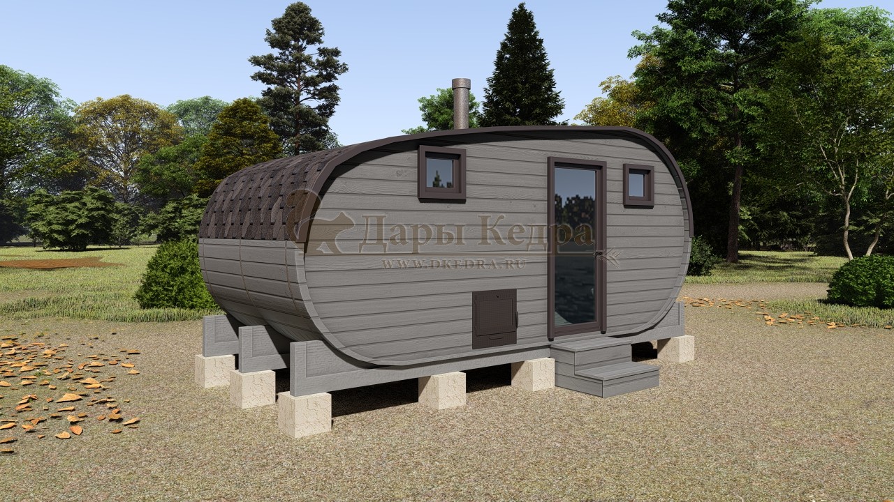 Баня-бочка буханка из кедра 4 метра Это более просторная модель за счет увеличенной высоты потолков и ровного пола. В такой модели раздевалка совмещена с моечной. Тут установлен душевой поддон, вешалка, полочка и лавочка из кедра. В парильном отделении по обе стороны расположены двухуровневые открытые полки, печь находится между ними у дальней стены. Время растопки такой бани не превышает 30 минут. По вашему желанию баню-бочку можно укомплектовать козырьком, верандой и печью с внешней загрузкой, благодаря которой весь мусор во время топки остается на улице. Баня-бочка буханка не требует полноценный фундамент, поэтому при необходимости ее можно перенести в другое место. Обращаем Ваше внимание, что в стандартную комплектацию бани входят полки открытого типа в парной с обеих сторон. Дополнительно можно заказать полок закрытого типа или лавку! Кедр обладает ароматическими свойствами. Он не деформируется и влагоустойчив, при правильном уходе за деревом на нем не развиваются грибки и плесень.