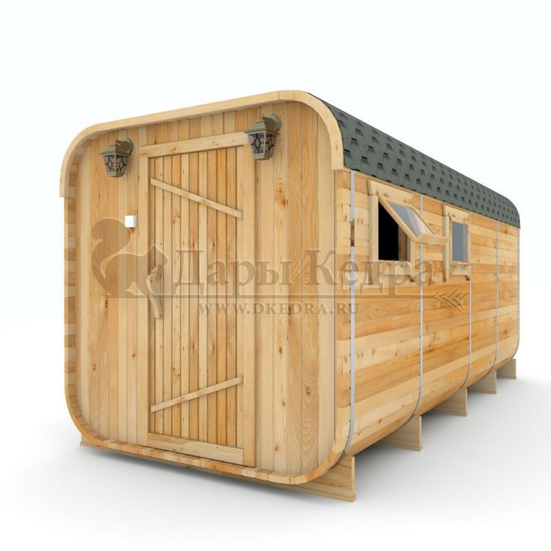 Баня-бочка квадро из кедра с козырьком (все размеры) Это прямоугольное изделие с закругленными углами. За счет такой конструкции во время топки воздух циркулирует по кругу, поэтому баня-бочка нагревается не более 30 минут. Козырек не только украшает баню, но и защищает оставленную обувь от дождя. Лавочки из кедра находятся по всей длине бани-бочки с обеих сторон. Печь расположена в парилке около дальней стены. В зависимости от выбранного размера баня-бочка квадро с козырьком имеет следующую комплектацию: Баня-бочка квадро 2,5 метра - парилка; Баня-бочка квадро 3,5 и 4,5 метра - раздевалка, парилка; Баня-бочка квадро 5,5 метров - раздевалка, парилка, моечная. По вашему желанию ее можно укомплектовать печью с внешней загрузкой, благодаря которой весь мусор вовремя топки остается на улице. Баня-бочка квадро не требует полноценный фундамент, поэтому при необходимости ее можно перенести в другое место. Обращаем Ваше внимание, что в стандартную комплектацию бани входят лавки в парной с обеих сторон. Дополнительно можно заказать полок открытого или закрытого типа! Кедр обладает ароматическими свойствами. Он не деформируется и влагоустойчив, при правильном уходе за деревом на нем не развиваются грибки и плесень. Обращаем Ваше внимание, что данную модель бани-бочки можно изготовить с ровным полом. Эта дополнительная опция и оплачивается отдельно!