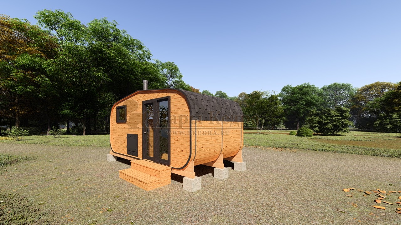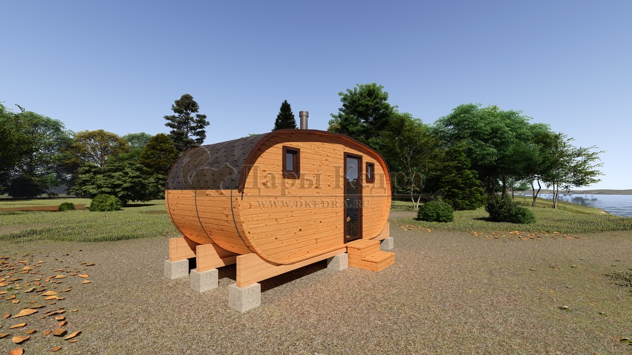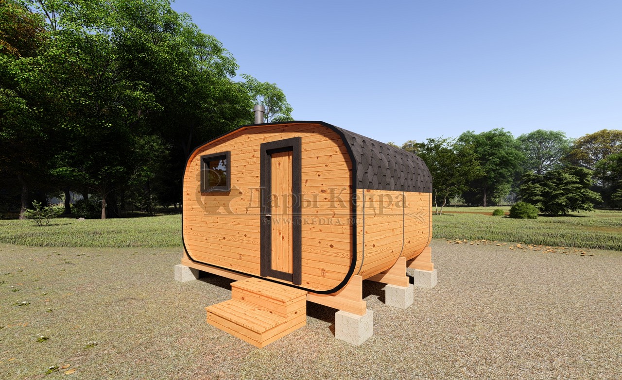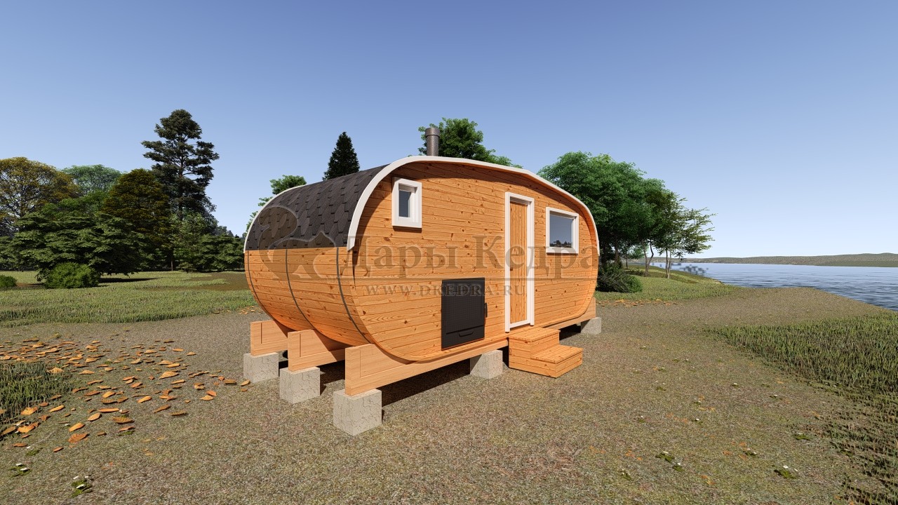 Баня-бочка овальная из кедра 4х2,2 метра Овальная баня-бочка из кедра просторная и вместительная. Имеет два отделения: раздевалку, которую можно использовать как комнату отдыха, и парилку. Для удобства пользования раздевалка оснащена лавочкой, полкой и вешалкой из кедра. В парильном отделении располагается печь и двухуровневый открытый полок. Для установки такой модели не требуется полноценный фундамент, поэтому при необходимости ее можно перенести на другое место. Так же баню-бочку можно укомплектовать верандой со скамейками, козырьком и печью с внешней загрузкой, благодаря которой весь мусор после топки останется на улице. Древесина кедра насыщена эфирными маслами и фитонцидами, которые активируются при воздействии температур. Таким образом, парение в каркаско-щитовых банях из кедра вдвойне полезно.