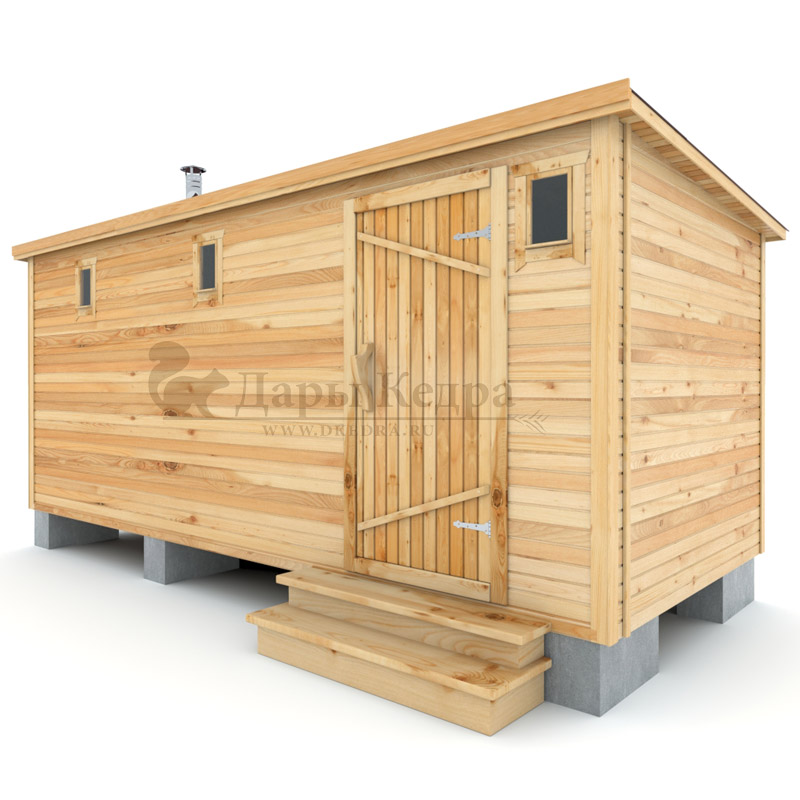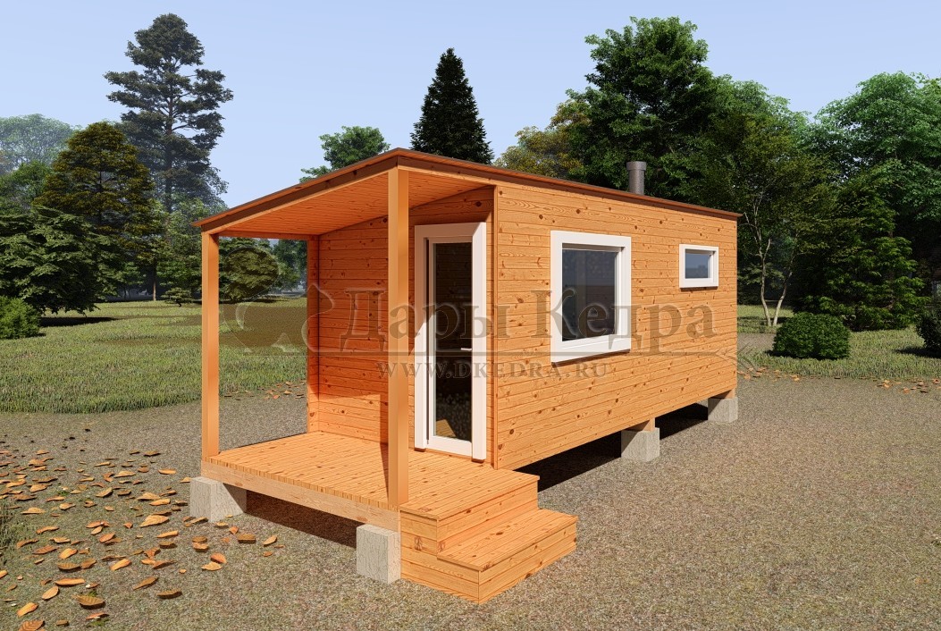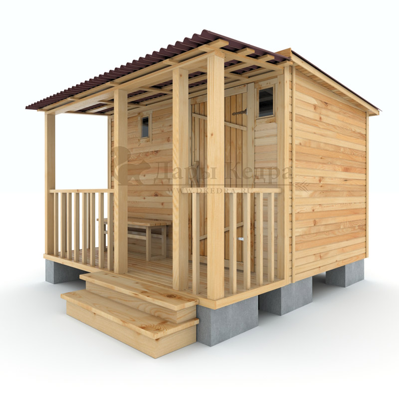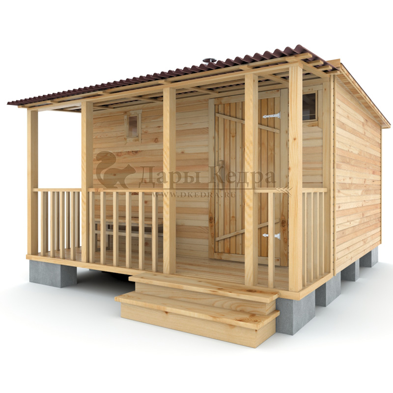 Каркасно-щитовая баня из кедра «Мини» с верандой Это классическая прямоугольная модель бани с двумя отделениями: парилкой и раздевалкой. Для удобства пользования раздевалка оснащена лавочкой и вешалкой. Парилка оборудована двухуровневым открытым полком и печью. За счет небольшой конструкции баня нагревается в течении 30 минут. На просторной веранде можно оставить вещи или отдохнуть после парения. Каркасно-щитовую баню можно заказать как в готовом, так и в разборном варианте. В разборной модели готовые щиты из кедра быстро собираются в полноценное строение, что также позволяет исключить лишний строительный мусор. Такая баня не требует полноценный фундамент, поэтому при необходимости ее можно перенести в другое место. Обращаем Ваше внимание, что в стандартную комплектацию бани входит полок открытого типа в парной. Дополнительно можно заказать полок закрытого типа или лавку! Древесина кедра насыщена эфирными маслами и фитонцидами, которые активируются при воздействии температур. Таким образом, парение в каркаско-щитовых банях из кедра становится еще полезнее.
