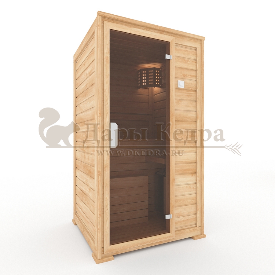 Одноместная финская сауна кабина из кедра и липы с электрокаменкой Это специально оборудованная готовая деревянная кабина для сухого и влажного парения. Электропечь нагревает пространство внутри и позволяет сбрызгивать камни водой, слегка увлажняя воздух. Такая процедура позволяет избежать перегрева. Сауна обшита снаружи и внутри вагонкой из липы и имеет теплоизоляционный слой. Финская сауна с электропечью подойдет, как для домашнего использования, так и для коммерции. Доставляется в разборном виде щитами, собирается по инструкции с помощью шуруповёрта. Обращаем Ваше внимание, что в стоимость сауны уже включена дверь с закаленным стеклом в раме из кедра с фиксатором и деревянным фасадом справа. Вы можете заменить фасад на цельностеклянный с безрамной дверью за дополнительную плату